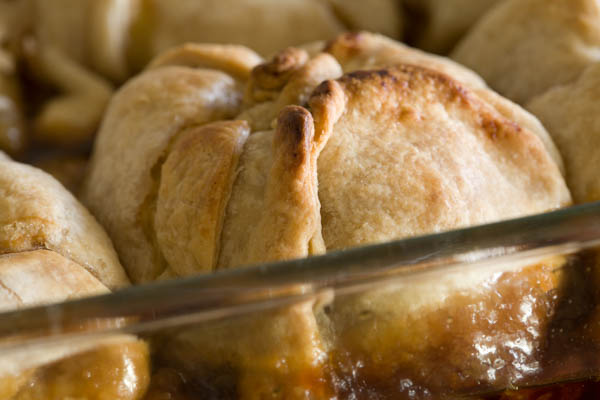 McIntosh or Macoun apples rolled in cinnamon sugar, wrapped in a buttery crust (we offer two superb pastry recipes), and baked to high, singing creaminess. A caramel syrup bathes everything in bittersweet burnt sugar.