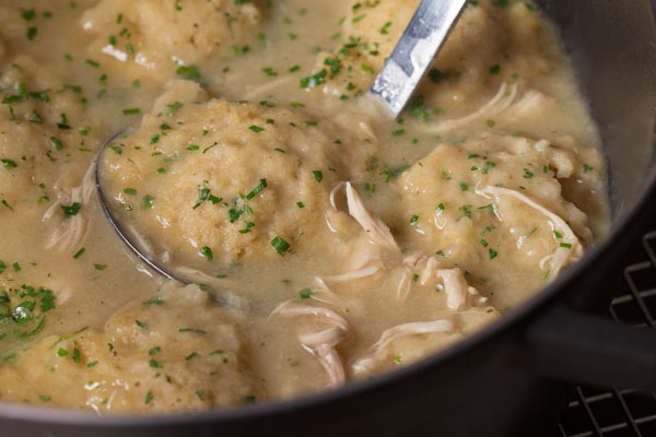 Nothing could be simpler: a pot, a chicken, a couple of scoops of flour and a measure of fat. But in the South, Chicken and Dumplings is fraught with emotional interpretation, real or imagined legacies, and the hidden pressures of family righteousness. It can become a cultural challenge, too, because there is no agreement regarding even the name or form of this dish: chicken and dumplings, slicks, slippery dumplins, etc.