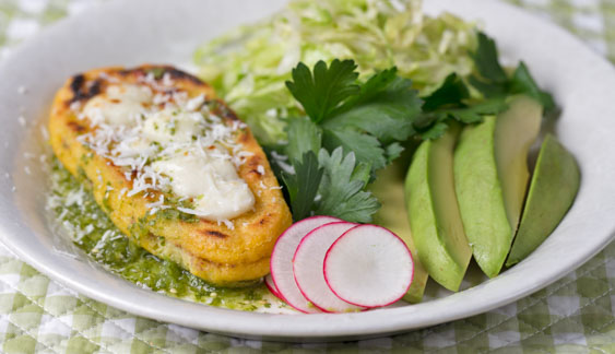 We shrank monster huaraches down to a civilized plate size for the ultimate crisp-to-creamy tension. Oh, and they’re made with homemade masa, not the instant stuff from the bag. Masa slippers with rich refried beans sandwiched between get griddled up, hot and crackling. They’re dressed on the plate with a flourish of melted queso fresco, shredded lettuce, grated cotija cheese, and a splash of fresh salsa verde.