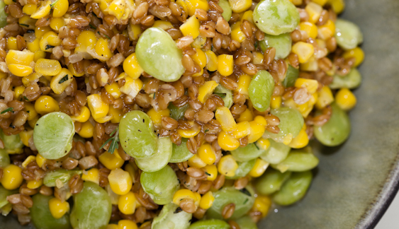 Melt the butter in a large skillet or sauteuse over low heat until it foams. Add the shallots and sauté, stirring frequently, until fragrant and softened, about 2 minutes. Add the chicken stock, increase the heat to medium, and bring to a simmer. Stir in the lima beans—fresh or frozen—and simmer, uncovered, for 2 to 3 minutes. Add the farro, corn, and cream and simmer, stirring occasionally, until the vegetables and farro are tender and the chicken stock and cream have reduced to a rich, luscious glaze, about 5 minutes. Stir in 1 teaspoon salt, ½ teaspoon pepper, and the thyme. Taste for seasoning and serve hot.