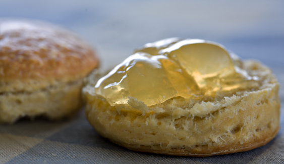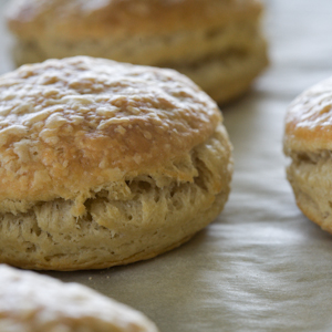 Anyway, we decided to craft a raised biscuit recipe that would make raised biscuits proud. (There aren’t any real raised biscuits around, so competition was light.) Using classic biscuit dough proportions and hydration, we made a foundation dough with flour, milk, salt, and a modicum of instant yeast—in French culinary parlance, a détrempe. We added butter to the biscuit dough as one adds butter to a Danish dough. This means the butter is “sheeted,” or spread over the yeasted foundation dough and, through a series of rolling-pin driven mechanical turns, the dough becomes interleaved with butter. The technique produces biscuits with thin, crisp layers, a moist, webby interior, and a gorgeous rise.