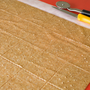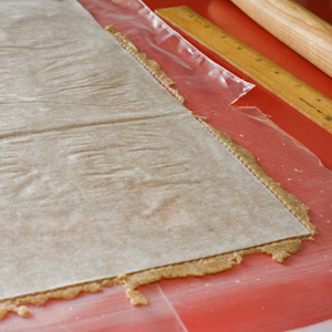 The processing part of the recipe is a cinch: 30 seconds and it’s done. The rolling and cutting of the dough does require some handiwork, but what it most requires is patience. Parchment paper on top of and beneath the dough allows you to make mistakes—you can lightly reroll, reshape, even patch. As long as you ultimately reach the dimensions specified, you and the crackers will be fine. There should be very little dough left over—just trimmings.