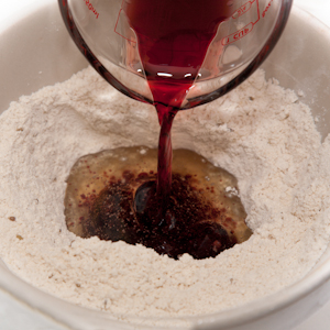 Turn the almonds into the food processor and process to a very fine meal, 30 to 45 seconds (fig. 1.1). With the machine running, pour the sugar through the feed tube and process 10 or 15 seconds longer. Transfer the almond-sugar mixture to a large mixing bowl. Add the flour, baking powder, salt, and anise seeds to the bowl and whisk well to combine. Make a well in the center of the flour mixture. Pour the wine and oil into the well (fig. 1.2) and fold the liquid ingredients into the dry with a rubber spatula. The dough will come together very easily.