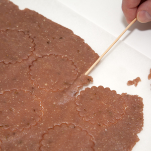 Adjust an oven rack to the upper-middle position and heat the oven to 325 degrees. Remove one sheet of dough from the refrigerator and slide the parchment with the dough onto the work surface. Using a 2¼-inch round plain or fluted cookie cutter, stamp out as many biscuits as possible. Use a toothpick or wooden skewer to lift out the scraps from between the stamped rounds (fig. 3.1). Ball the scraps up and set them aside. Dust the rounds with sugar and sprinkle lightly with anise seeds (fig. 3.2). Bake the biscuits on the baking sheet until uniformly golden, about 15 minutes. While the first batch is baking, stamp out rounds from the second sheet of dough and combine the scraps with those from the first batch. Roll out the scraps on a third parchment sheet, refrigerate, and then stamp out more biscuits. Bake the second and third baking sheets of biscuits one at a time. Let cool completely on a wire rack. Stored in an airtight container, the biscuits will keep for 4 or 5 days.