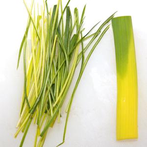 Prepare the leek: Trim away the root end and the tough or ragged green top ends of the leek. Cut the leek crosswise where the light and dark green parts meet. Slice each piece in half lengthwise and wash well. Cut the white and light green parts into half moons (you should have about 2 ounces, or ¾ cup) and set them aside for the custard base. Separate the dark green parts into 6- to 7-inch lengths and cut them into fine julienne (fig. 1.1). Set them aside for the garnish.