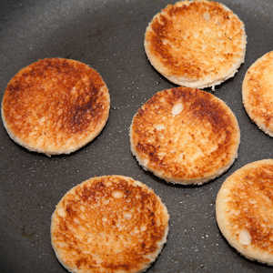 Brown the croutons: Heat the skillet in which the garlic butter was made over medium-low heat. Add the buttered bread rounds and cook until golden brown, about 2 minutes. Turn and brown the second sides, about 2 minutes (fig. 7.1). Remove from the heat, but leave the croutons in the skillet to keep them warm.