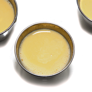 We use 2-ounce metal ramekins for our timbales—the sort restaurants use to serve drawn butter. They are narrower at the bottom than the top, and thus custards baked in them look elegant when unmolded. Tiny demitasse cups would be pretty, too. Straight-sided ceramic ramekins are tricky to unmold because they have a second depression around the lip, and are not as attractive crowning the soup.