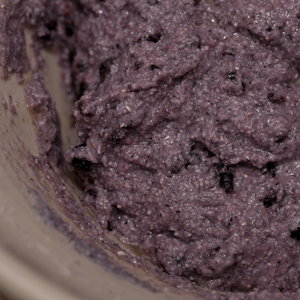 Turn the cornmeal, blueberries, and salt into a medium bowl. Set the bowl on a digital kitchen scale, tare the weight, and pour 7 ounces of boiling water into the cornmeal. Stir with a wooden spoon utensil to moisten the ingredients. The cornmeal should be a soft paste, in no way fluid. Cover the bowl and set it aside.
