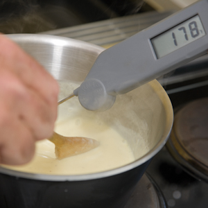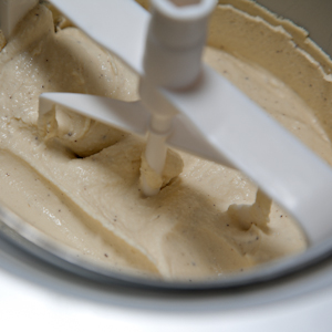 And speaking of the base, custards can be tricky. We think cooks tend to undercook custards, not overcook them. Cooking the yolks in custard properly will have a powerful influence on the ice cream’s ultimate consistency. Do use an instant-read thermometer and let it climb to around 180 degrees. Don’t stop stirring, though!