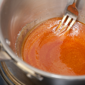 Make the caramel praline: Toward the end of the grits drying process, have ready a nonstick baking mat or a parchment paper–lined baking sheet. Pour the sugar into a clean, dry, heavy-bottomed medium saucepan. Set the pan over medium-high heat and allow the sugar to melt without stirring. When a band of colored sugar (caramel) appears bubbling along the edge of the saucepan, begin to stir the dry, white sugar on the top into the melted caramel with a diner fork. Reduce the heat to medium-low and continue stirring from time to time to incorporate the unmelted sugar into the caramel (fig. 3.1). When the sugar has completely melted, the caramel will have a glassy, deep amber sheen and show no granularity. Pour the caramel onto the baking mat or prepared baking sheet (fig. 3.2), tilting the surface so the caramel runs as thinly as possible. Remove the grits from the oven, sprinkle them over the hot caramel and use a small offset spatula to press the grits into the surface (fig. 3.3). Some of the grits will not stick to the caramel, and residual liquid from the grits may produce a few drops of caramel syrup on the praline. This does not matter. Set the praline aside and let cool completely.