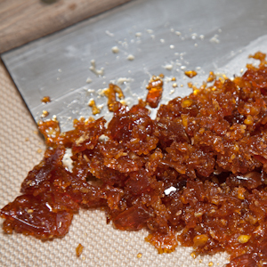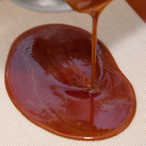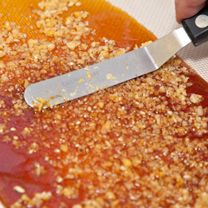 As for the caramel, we must tell you that although we don’t enjoy baking on Silpat mats, when it comes to confection work, they rule supreme. The silicone and fiberglass surface allows the caramel to remain supple longer than glass or metal. So you can pick the mat up and let the caramel run into a thin, beautiful sheet before it seizes up and hardens forever. You’ve got more time to press the grits into the caramel, too.