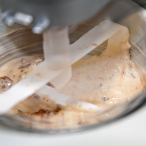 Churn and freeze the ice cream: Pour the chilled ice cream base into the canister of an ice cream maker and churn until the machine indicates the mixture is frozen, about 50 minutes (fig. 4.1). While the ice cream is churning, loosen the praline from the baking mat or parchment paper and chop it finely with a metal bench knife (fig. 4.2). Add the praline to the ice cream still in the machine and continue churning (fig. 4.3) until the ice cream has set once again. Remove the canister from the machine, cover with plastic wrap, and place it in the freezer to temper the ice cream, 2 to 3 hours.
