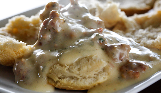 Sausage gravy is everywhere these days, gliding over split biscuits from Bojangles’ to Bob Evans. Nice see to an old favorite in play. But we all know that when fast food jumps on a regional American classic, authenticity is out of the running and flavor pouches are not far away. As a matter of fact, really bad sausage gravy is already pandemic: we’ve eaten umpteen versions of it ladled on crumbly, baking-powder biscuits in little places all over. Sausage gravy isn’t high cuisine—in fact, its mother, milk gravy, was a child of pan drippin’s and poverty. But sometimes the easiest things to make are the easiest to screw up.