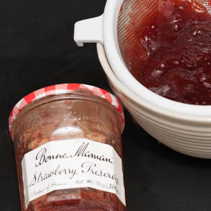 Should you happen to have homemade preserves on hand, by all means, crack them open! Having none ourselves, we purchased some very fancy, very pricey imports. The verdict: with no swirling, intoxicating notes of strawberry about them, both scored just a notch above meh. Much nicer in this cake were Bonne Maman preserves. Available in grocery stores nationwide, Bonne Maman preserves are not organic, but they are actually produced in France, where, as my French cooking teacher used to declare triumphantly, “You could eat a handful of American strawberries and they would never equal the flavor of one strawberry from the Provence!” Bonne Maman strawberry preserves contain no corn syrup. They do carry some natural pectin for thickness, which, for this cake, is not a bad thing. A 13-ounce jar will strain down to the 6 ounces of berries in heavy sauce required for the cake’s filling. Keep the strained-out portion to use as jelly or as a topping for ice cream.