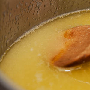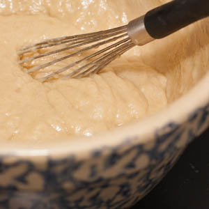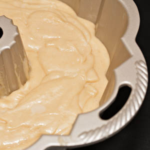 Adjust an oven rack to the lower-middle position and heat the oven to 325 degrees. Butter a 12-cup Bundt pan. Turn the flour, baking powder, and salt into a large mixing bowl and whisk to combine. Melt the butter in a small saucepan over medium-low heat and add the sugar. Stir until the mixture becomes sludgy and the sugar begins to melt but before the butter bubbles (fig. 2.1). Remove from the heat. In a medium bowl, whisk together the sour cream, eggs, and vanilla until thoroughly combined. Ladle some warm butter mixture into the egg mixture and whisk to warm. Add the remaining butter mixture to the eggs and combine well. Pour the liquid ingredients into the dry ingredients and fold gently with a rubber spatula until a thick batter results (fig. 2.2). Don’t worry about tiny lumps; do not overmix.