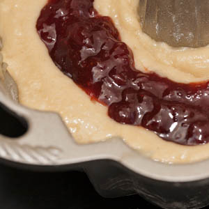Spoon 35 ounces (about three-quarters) of the batter into the prepared pan and smooth with the back of a spoon. With a moistened finger, make a trough in the center of the ring of batter. Spoon the preserves into the trough (fig. 3.1). Scrape the remaining batter into the pan and use the back of a wet spoon to smooth the batter over the preserves (fig. 3.2). Bake the cake until it is nicely risen, light golden brown, and the center springs back when touched with a finger, about 50 minutes (fig. 3.3). Let the cake cool in the pan on a wire rack for 10 minutes, and then invert it onto the rack. Continue to let cool until just barely warm, about 1 hour.