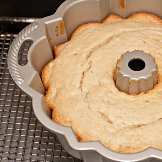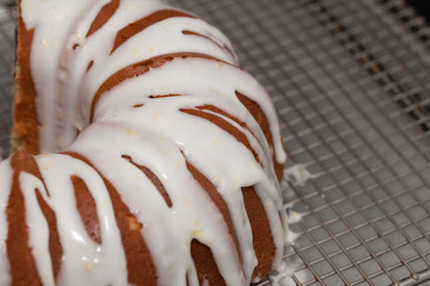 Place cake on its rack on a rimmed baking sheet. Pour or spoon the glaze over the cake, allowing it to drip down the sides (fig. 5.1). Feel free to spoon the still-pourable glaze from the baking-sheet floor and reglaze if you wish. Allow the glaze to harden for about 10 minutes before serving the cake.