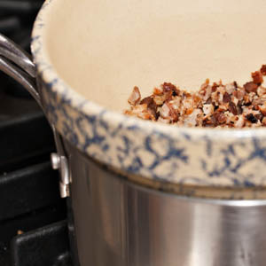 Warm the meat and make the goetta: Transfer the reserved minced meat to a medium heatproof bowl, cover tightly with aluminum foil, and set the bowl over a correspondingly sized saucepan filled with about 3 inches of water. Set the saucepan over medium-high heat and warm the meat until hot, stirring occasionally, about 10 minutes (fig. 7.1).