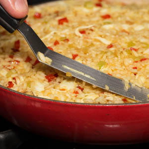 With your hands protected by oven mitts, quickly pull the hot braiser out of the oven and set it on a burner at medium heat if your stove is powerful or medium-high if it is timid. Drop the remaining 0.5 ounce (1 tablespoon) of butter into the pan and swirl to coat the sides and bottom; the butter will sputter and brown slightly. Spoon the rice mixture into the pan without delay, mounding it slightly in the middle, and then press down and smooth the surface with a small offset spatula (fig. 5.1); this process should take no more than 1 or 2 minutes. Slide the braiser into the oven and cover with the hot lid. Bake for 10 minutes, until the rice is tender and the bottom of the pilau is browned and crisp.