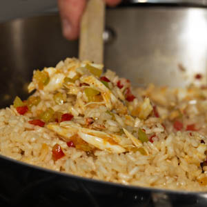While the rice is cooking, in a large skillet, warm 0.5 ounce (1 tablespoon) of the butter over medium heat. Add the shallots, celery, and ¼ teaspoon of salt and cook, stirring frequently, until the vegetables are softened and fragrant, 3 to 5 minutes; do not allow them to color. Add the sweet pepper, red pepper flakes, and curry powder and sauté until the pepper is tender (fig. 4.1), about 2 minutes. Add the Madeira and simmer until it is reduced to a glaze, 1 to 2 minutes. Turn the crabmeat into the aromatics and carefully fold with a heatproof rubber spatula until the crabmeat is warmed through. Now turn the hot rice into the skillet and fold until well combined (fig. 4.2). Taste for seasoning, adding additional salt if needed and seasoning to taste with black pepper.