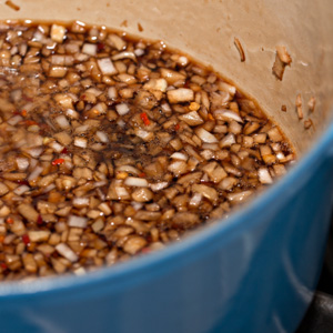Make the dipping sauce: In a small heavy-bottomed saucepan, combine the balsamic, maple, bay, salt, and pepper flakes. Bring the mixture to a simmer over medium heat, stirring to combine. Stir in the onions and return to a simmer. Remove the pan from the heat and let the pickled onions cool completely (fig. 1.1). Spoon some pickled onions into a small bowl (taking very little balsamic with them) and mix in Dijon mustard to taste. Set the dipping sauce aside until you’re ready to serve.