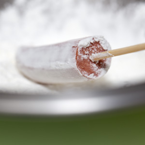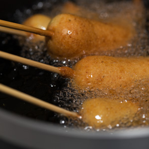 We’re suggesting you buy a Fry Daddy. His fry canister is deep and rather narrow, he heats up in a hurry, and he’s cheap. Fry Daddy don’t bother with settings or even an on/off switch, so in those respects he’s kind of a deadbeat dad, but he gets the job done without any gimmicks. Of course, you can fry in anything. Having a vessel about 7 inches high and 6 inches in diameter and the ability to twirl the wooden skewers around in the oil, however, is essential for this recipe.