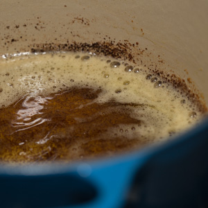 While the bennecake is toasting, melt the butter in a small heavy-bottomed saucepan over medium heat, stirring frequently, until the milk solids are deeply browned and the butter has the aroma of toasted nuts, about 10 minutes (fig. 2.1). Pour the butter into a large heatproof bowl, stir for 30 seconds or so to release some of the heat, and let cool until barely warm to the touch.