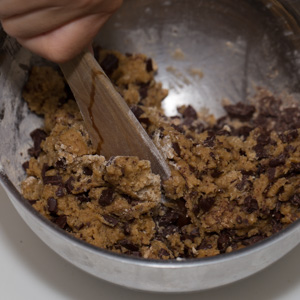 Toss the brown sugar and granulated sugar together in a small bowl and work it together with your fingers to smooth away any lumps. Add the sugar, vanilla, and salt to the cooled browned butter and whisk until the sugar is evenly moistened. Add the egg and whisk vigorously (fig. 4.1). Empty the dry ingredients into the butter-sugar mixture and stir with a rubber spatula until almost completely incorporated. Dump in the chopped chocolate and continue to mix until the chocolate is evenly distributed throughout the dough (fig. 4.2). Cover the bowl with plastic wrap and set aside to allow the dough to hydrate while the oven heats. (At this point, the dough can be refrigerated for up to 3 days. Allow it to come back to room temperature before portioning and baking.)