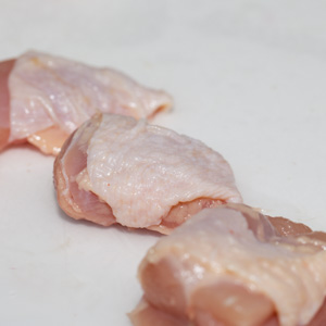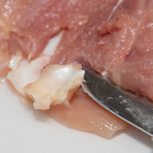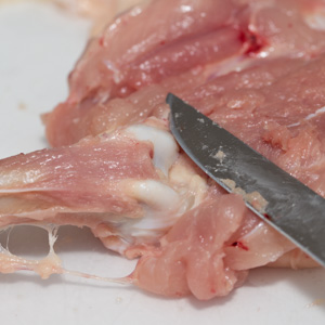 Trim the excess fat and skin from the chicken thighs. To remove the bone from each piece, turn the thigh skin-side down. Locate the bone and the line of fat that runs along the length of the bone (fig. 2.1). Beginning at the top of the thigh and using the tip of a sharp paring or boning knife, cut around the tip of the bone to free it. Now use the tip of the knife to scrape/cut the meat away from both sides of the bone (fig. 2.2). Hold the knife blade horizontally and slide it under the midsection of the bone, and cut downward toward the end of the bone to free it. A piece of cartilage will remain attached to one edge of the thigh meat. Trim it off (fig. 2.3). Once you’ve removed the bones from all of the thighs, use a very sharp chef’s knife to cut the thighs into rough 1½-inch pieces, keeping the skin attached as best you can (fig. 2.4); if your knife is razor-sharp, it’s easier to do this with the skin side facing up. Don’t obsess over making perfect and evenly shaped chunks.