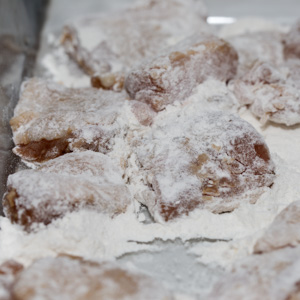 When you’re ready to fry, remove the ponzu from the refrigerator to allow it to come to room temperature. Set a large fine-mesh strainer over a bowl. Set a wire rack in a baking sheet and line the rack with a double thickness of paper towels. Drain the chicken and shake the strainer to release as much excess marinade as possible. Pour 3 cups of peanut oil into a Fry Daddy or 4 cups into a 5½ quart Dutch oven (the oil should reach a depth of about 1½ inches). Plug in the Fry Daddy or set the Dutch oven over medium-high heat. Put the rice flour, sesame seeds (if using), and a big pinch of salt in a shallow baking dish and mix well to combine. Add the chicken pieces to the rice flour mixture and toss until each piece is completely coated (fig. 6.1).