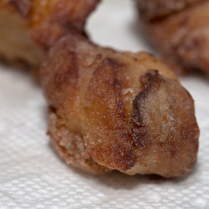 We find Japan’s fetishization of Kentucky Fried Chicken pretty hilarious considering that Japan itself is the source of real fried chicken deliciousness in the form of chicken karaage. (Karaage, pronounced ka-ra-ah-geh, refers to a general class of fried food; chicken karaage, specifically, is called tatsutaage.) The dish consists of dainty dark meat morsels with skin attached—not whole thighs, because chopsticks are the chosen implements, after all, rather than fingers—marinated in soy, sugar, and aromatics, and then coated with starch and fried. The result is nothing short of addictive.