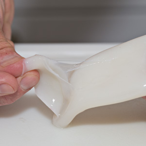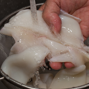 If you find “fresh” squid at the fish market, it was probably previously frozen and farm raised. Yes, it would be great to grab some fresh wild-caught squid down at the docks in the morning to serve that night. Probably not going to happen. The good news is that squid, being pure muscle, freezes really nicely. Also, if it is or was frozen, somebody may have already cleaned it for you. Cleaning squid is yucky. Let’s just put that out there. Even “cleaned” squid is pretty yucky. In the event you are fortunate to find fresh, wild-caught squid, you’re going to have to clean it yourself. The Internet is positively brimming with squid cleaning tips—but you’ll find only an abridged version below, as we encourage you to look for cleaned squid. Nothing against tentacles, but we also recommend a “tube only” approach to this dish.