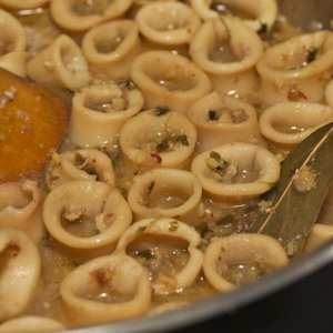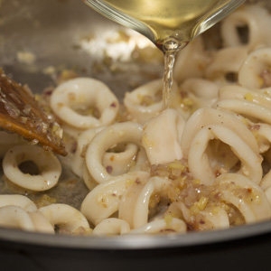 Heat 2 tablespoons of the olive oil in a heavy-bottomed 4-quart sauté pan or rondeau over medium-high heat. Add the squid and sauté until the rings are opaque, about 2 minutes. Sprinkle with ½ teaspoon salt and ½ teaspoon pepper. Using a slotted spoon or wire skimmer, transfer the squid to a bowl, leaving the juices in the pan. Add the remaining 1 tablespoon olive oil and the onion to the pan and sauté over medium heat until the onion is soft and fragrant, about 5 minutes. Add the ginger and garlic and sauté, without allowing the ingredients to color, until softened and fragrant, about 5 minutes more. Return the squid to the pan and pour in the ½ cup white wine (fig. 2.1). Add the hot fish stock, marjoram, bay leaf, and red pepper flakes. Stir and cover. Bring to a simmer, and then reduce the heat and simmer gently, stirring occasionally, until the squid is tender, about 1 hour (fig. 2.2).