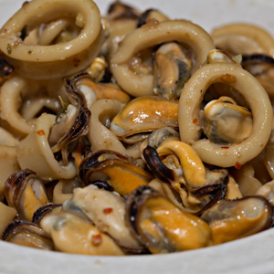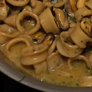 Polenta di Riso with Braised Squid and Mussels