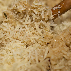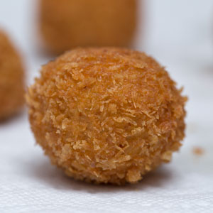 As for the magic we mentioned above, this recipe calls for smoked scamorza, a spun mozzarella-style cheese, because it happens to be particularly good with sopressatta (a dry Italian sausage). But, seriously, you don’t have to go with either one. A nice salami and fontina Val d’Aosta are perfectly capable of replacing them. For that matter, if you prefer cocktail-size arancini, skip the stuffing altogether! Either way, panko is the bread crumb of choice because it crisps up far better than your average fine bread crumbs.
