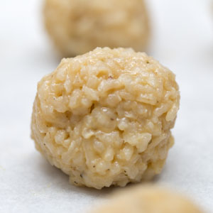 Line a baking sheet with parchment paper. Divide the chilled risotto mixture into fifteen evenly sized portions, each about 1.6 ounces in weight (or about 3 generous tablespoons in volume). Using your hands and a light touch (the risotto may be a little gooey but rinsing your hands after shaping every 2 or 3 balls helps), roll each portion into a rough ball—the shape does not need to be perfect—and set the ball on the prepared baking sheet (fig. 4.1). (For mini arancini, weigh out thirty 0.8-ounce portions and shape them into neat balls. They will be too small for stuffing, but delightfully dainty with cocktails.)
