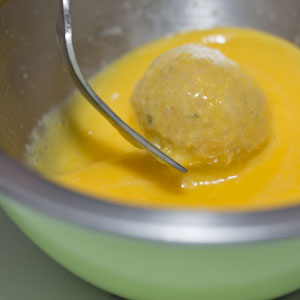 When you are ready to fry the arancini, in a medium bowl, whisk together the remaining 2 eggs, the water, and the olive oil. Put the panko in a wide, shallow bowl or small baking dish. Have ready a clean baking sheet. Gently drop 3 or 4 chilled risotto balls into the panko and roll them around until coated on all sides. One at a time, lift each ball out, dust off excess panko, and place it on the baking sheet (fig. 6.1). Add a panko-coated ball to the egg and roll it around with a fork until coated on all sides (fig. 6.2). Lift the fork and allow the excess egg to drip off, and then drop the ball into the panko again (fig. 6.3). Roll the ball around, gently patting gently to help the panko adhere in a thick, even layer. Lift out the ball, gently reshape it into a nice sphere, and return it to the baking sheet. Repeat until all of the risotto balls are breaded.