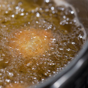 For this recipe, you will need a small saucepan and a heavy-bottomed medium saucepan; a wooden spoon; a ladle; a medium bowl and a small bowl; a whisk; two or three baking sheets; parchment paper; a wide, shallow bowl or small baking dish; a heavy-bottomed saucepan (with roughly a 7-inch diameter and 5-inch depth) or a Fry Daddy; an instant-read or deep-fry thermometer; and a wire skimmer.