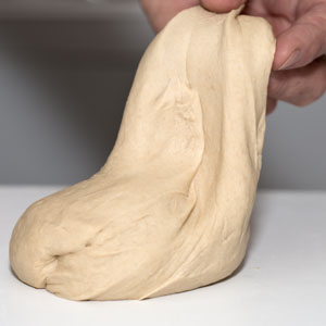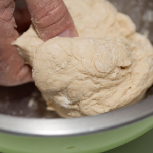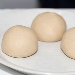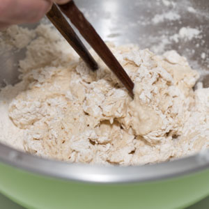 Pour the hot water into the flour and stir with chopsticks until a rough dough comes together (fig. 2.1). With your hands, lightly knead the dough in the bowl (fig. 2.2) until it forms a cohesive mass. Transfer the dough to a counter top and knead without adding flour until it is smooth, satiny, and elastic (fig. 2.3), about 5 minutes. Turn the dough into a gallon-size zipper-lock bag, seal the bag, and allow the dough to rest for 30 minutes.