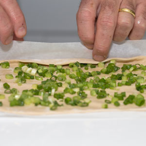 Also while the dough is resting, in a small skillet over medium-low heat, toast the benne seeds, stirring very frequently, until they are a shade darker in color and only lightly fragrant. Don’t over-toast them, as they will become bitter if you do. Pour the seeds into a suribachi, if you own one, or into a clean coffee grinder used exclusively for grinding spices and let the seeds cool completely. If you’re using a suribachi, grind the seeds with a surikogi, or pulse them in the spice grinder, until they are broken down to a coarse powder (if you’re using a spice grinder, be careful not overprocess them, lest they become an oily paste). Empty the seeds into a small bowl. Finely chop enough scallions (fig. 4.1) to yield 1½ cups (3.5 ounces) and add them to a small mixing bowl. Drizzle the scallions with the butter, stir with a fork until the butter is evenly distributed, and set aside.