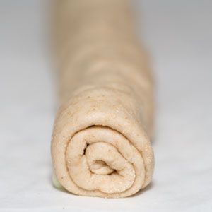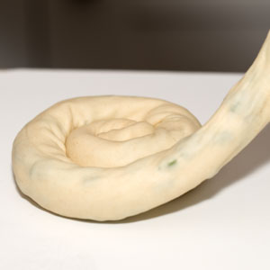 Cut four 12-inch squares of parchment paper and set them aside. Pull the dough out of the zipper-lock bag—the dough may try to leave bits of itself behind in the bag, but they will pull away easily and reincorporate into the mass of dough. Cut the bag open with scissors, creating a large sheath, and set aside. Using a bench knife, divide the dough into 4 equal pieces (4 ounces each, if you’re keeping score). Without adding flour, round the pieces against the counter with the palm of your hand. Place 3 of the pieces on a plate (fig. 5.1) and cover them with a clean, barely damp kitchen towel. Sprinkle a parchment square with flour, set the fourth round of dough on the paper, and sprinkle flour on top. Using a rolling pin, roll out the dough to an 8- by 7-inch rectangle. Gently lift the dough to make certain it isn’t sticking to the parchment and lightly flour underneath if necessary. Distribute one-quarter of the buttered scallions evenly over the rectangle, then sprinkle evenly with one-quarter of the ground benne seeds, a big pinch of flaky sea salt, and a little white pepper. Starting from a long side, tightly roll up the dough, using the paper to lift the lip (fig. 5.2) and help roll it. You will have a cylinder about 9 inches long (fig. 5.3). Pinch together the seam and the open ends to seal them. Roll the cylinder back and forth on the counter to lengthen it by a couple of inches. Pick up one end of the cylinder, hold the other end in place, and coil the cylinder around the fixed end to form a snail (fig. 5.4); tuck the end under the coil. Flour the parchment square, place the coil on top, and cover with the reserved zipper-lock bag. Roll out, fill, and coil the remaining 3 pieces of dough in the same way.