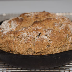Today’s soda bread doughs are generally stout enough to be free-formed and baked on a sheet pan or in a black skillet. But originally the bread was placed in a three-legged Dutch oven in live coals, its lid smothered with additional coals. This is a brilliant notion in a couple of respects. First of all, a slack dough begs for walls for support. Secondly, the closed environment of a Dutch oven traps the steam released by the loaf, thereby keeping its surface moist and supple, which allows the dough to expand as it bakes. When the steam burns off, the bread develops a superb crust.