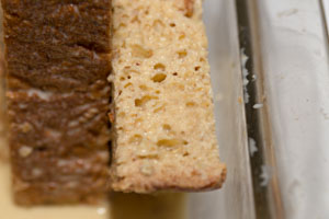 In a medium bowl, whisk the eggs until well combined. Add the vanilla and cinnamon and whisk again, and then whisk in the half-and-half. Pour the mixture through a medium-coarse sieve directly onto the bread; discard the bits that remain in the sieve. Let the bread soak for about 10 minutes. Using your fingers or a carving fork, turn the pieces over (fig. 3.1). Continue this process of resting and turning the slices at intervals, standing them up on their edges from time to time (fig. 3.2), until the brioche has completely absorbed the custard and the baking dish is essentially dry (fig. 3.3), about 1½ hours. Don’t push on the slices, try to rush the soaking time, or refrigerate the bread as it soaks.