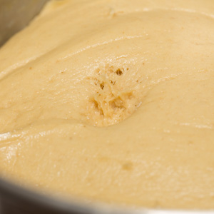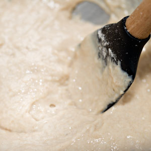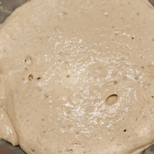 Sprinkle the yeast over the milk and allow it to soften without stirring for a couple of minutes, and then whisk until the yeast fully dissolves. Turn the flour into the yeast mixture and stir with a wooden spoon until a soft batter-like dough forms (fig. 2.1). Cover the bowl with plastic wrap and let proof at room temperature for 45 minutes, by which time the starter will be puffy and show small bubbles (fig. 2.2).