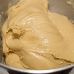 Attach the bowl and flat beater attachment to the mixer. With the mixer running on low speed, add about a cup of the dry ingredients and beat to create a strong dough, about 3 minutes. Add half of the beaten eggs and mix well, and then add half of the remaining dry ingredients and mix until combined. Scrape down the bowl with a rubber spatula as needed. Add the remaining eggs and dry ingredients in the same way. You will have a shiny, wet, scrappy dough (fig. 4.1). Mix on medium speed for 10 seconds, and then reduce the speed to low. Add the butter 2 to 3 tablespoons at a time, mixing until the butter is fully incorporated after each addition before dropping in more; this process should take about 4 minutes. Pull the dough off the flat beater and replace the beater attachment with the dough hook. Knead the dough on low speed until it is smooth, shiny, and extensible and pulls away from the sides of the bowl (fig. 4.2), about 8 minutes. Remove the bowl from the mixer and pull the dough off the hook. Cover the bowl with plastic wrap and allow the dough to rise at room temperature until it has nearly doubled in volume and a floured thumb leaves a depression in the surface (fig. 4.3), about 2 hours.
