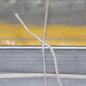 When you are ready to shape the dough, grease a heavy-gauge 10 by 5 by 3-inch loaf pan with butter. Remove the dough from the refrigerator and use the plastic dough scraper to turn it out onto the work surface. Flour your hands and pat the dough into a rough rectangle. Roll the rectangle into a tight cylinder (fig. 6.1) about 7 inches long, pressing along the seam every quarter turn or so. Pinch the outer seam to seal well. Turn the cylinder seam side down and use your hands to roll the dough into a uniformly thick cylinder (fig. 6.2) about 10 inches long. Place the dough in the prepared pan—it should make contact with the pan on both ends. In a small bowl, beat together the egg yolk and milk and brush the dough sparingly with the egg wash, taking care not to let it run down the sides of the pan; reserve the remaining egg wash for later. Cover the pan with plastic wrap and secure the plastic with a piece of kitchen twine (fig. 6.3) or a rubber band. Let the dough proof at room temperature until it is well risen and slightly pocked, about 2 hours. One hour into proofing, adjust an oven rack to the middle position, set a pizza stone on the rack, and heat the oven to 350 degrees.