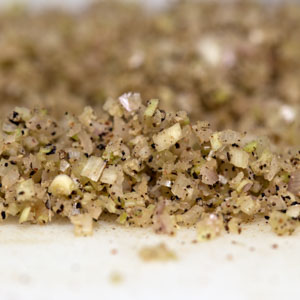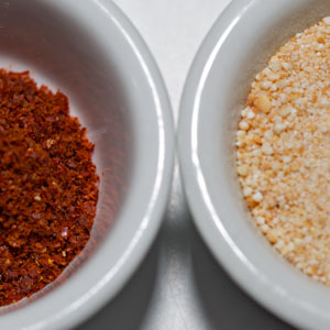 In an electric coffee grinder dedicated to spice-grinding, pulse the toasted rice to a coarse powder, 3 or 4 pulses. Return the rice to the bowl. Break the stem off the toasted chiles and shake out the seeds; break the pods into small bits and add them to the grinder. Process the chiles, vigorously shaking the grinder, until you have a slightly coarse powder. Tip the chile powder into a second small bowl (fig. 2.1).