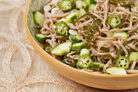 Divide the cooked soba among 4 individual bowls. Sprinkle with the pickled cucumbers and okra and the wakame, dividing them evenly. Finely chop the scallions and sprinkle them over. Ladle about ⅓ cup of the sauce into each bowl, sprinkle with benne seeds, and serve.