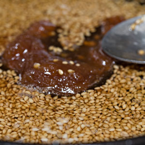 While the carrots roast, in a small skillet, melt the butter over low heat. Add the garlic and stew the cloves very gently, spooning the butter over them, until they’re fragrant, fork-tender, and translucent, about 5 minutes. Transfer the garlic to a small dish and set it aside. Add the benne seeds to the skillet and cook over medium heat, stirring constantly, until the seeds are lightly toasted but not darkened, 2 to 3 minutes. The butter may color slightly—and that is a good thing—but the seeds should remain relatively light (fig. 2.1). (Unhulled seeds such as ours will not produce color change until they are burned, so taste a few to gather an impression—but watch out! They’re hot!). Remove from the heat, add the honey (fig. 2.2), the remaining ⅛ teaspoon salt, and the reserved garlic and stir to combine.