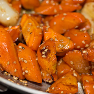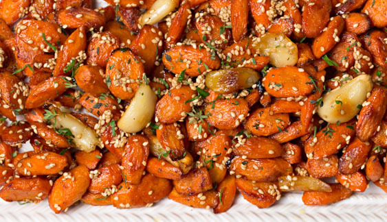 Most people enjoy nibbling a crisp, sweet raw carrot, but cooked carrots experience considerably less audience appreciation. At least that was the case until the oven wrested the thankless task of cooking out of the saucepan and saved the vegetable from drowning in its own tears. (Props to the grill, too.) Root vegetables in general, and carrots in particular, love dry heat. The oven draws moisture from them and eventually evaporates most of it altogether, intensifying the carrots’ flavor and concentrating the sugars on their surface. The end effect is a richer, rounder taste impression than carrots braised in butter, steamed, boiled, or even stir-fried. They have a less straightforward sweetness and a starchy-firm glazed texture around their contours. And if all those qualities weren’t enough, we introduce mild poached garlic; a touch of raw honey; and crackling, nutty benne seeds cooked in butter, giving the carrots an exotic halvah-esque allure. A flourish of herbs and this becomes a memorable side dish that complements fish, flesh, fowl—or rice and other vegetables—and befits any holiday meal.